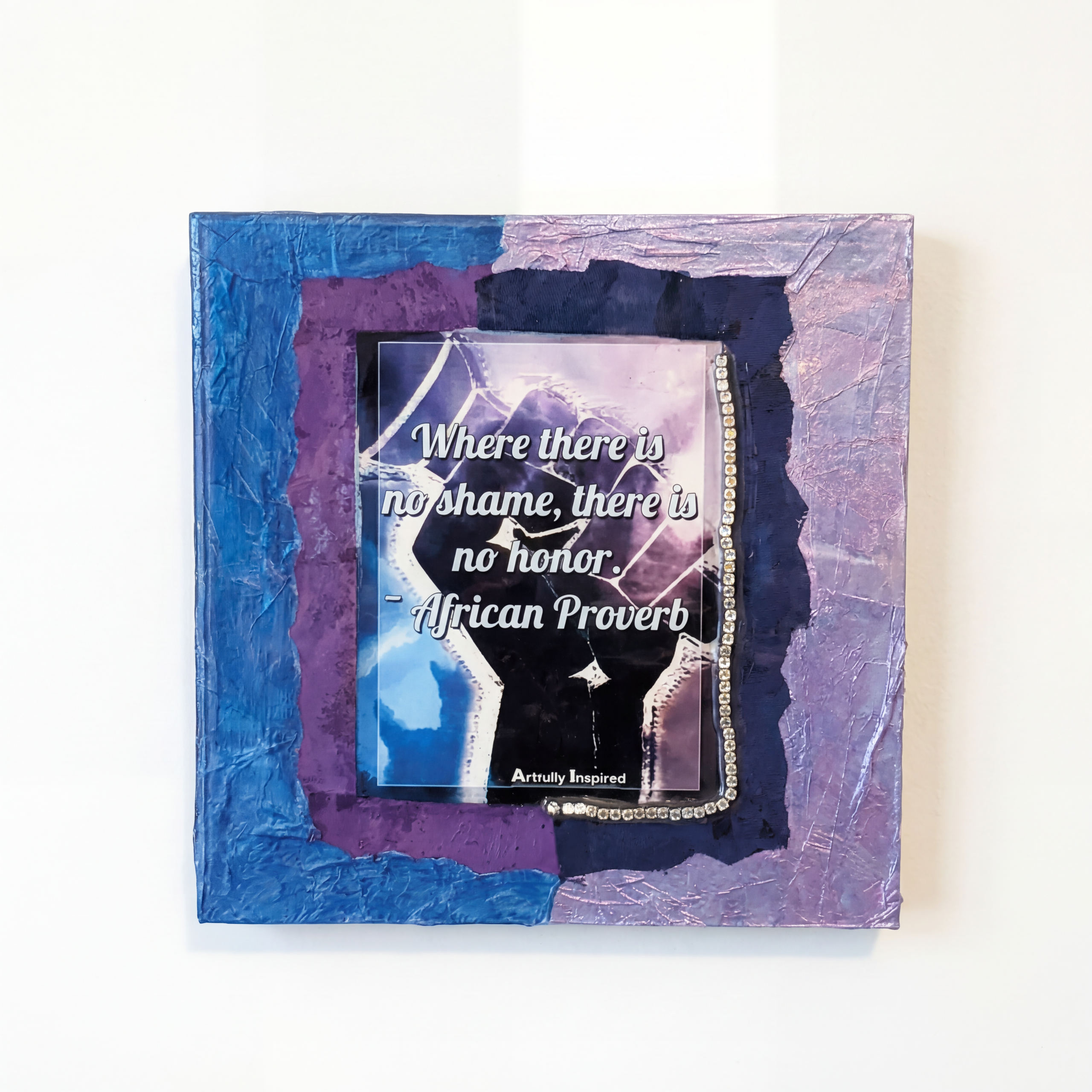 Introducing the “No Honor” Art Piece – a captivating blend of cultural wisdom and artistic expression. Inspired by the profound African proverb, “Where there is no shame there is no honor,” this mixed media masterpiece is a powerful reminder of our inherent human dignity. This artwork encapsulates the essence of our shared humanity, inviting you to reflect on the importance of embracing honor and dignity in every aspect of life. Display it proudly in your space and let it inspire you daily to live with grace and integrity.