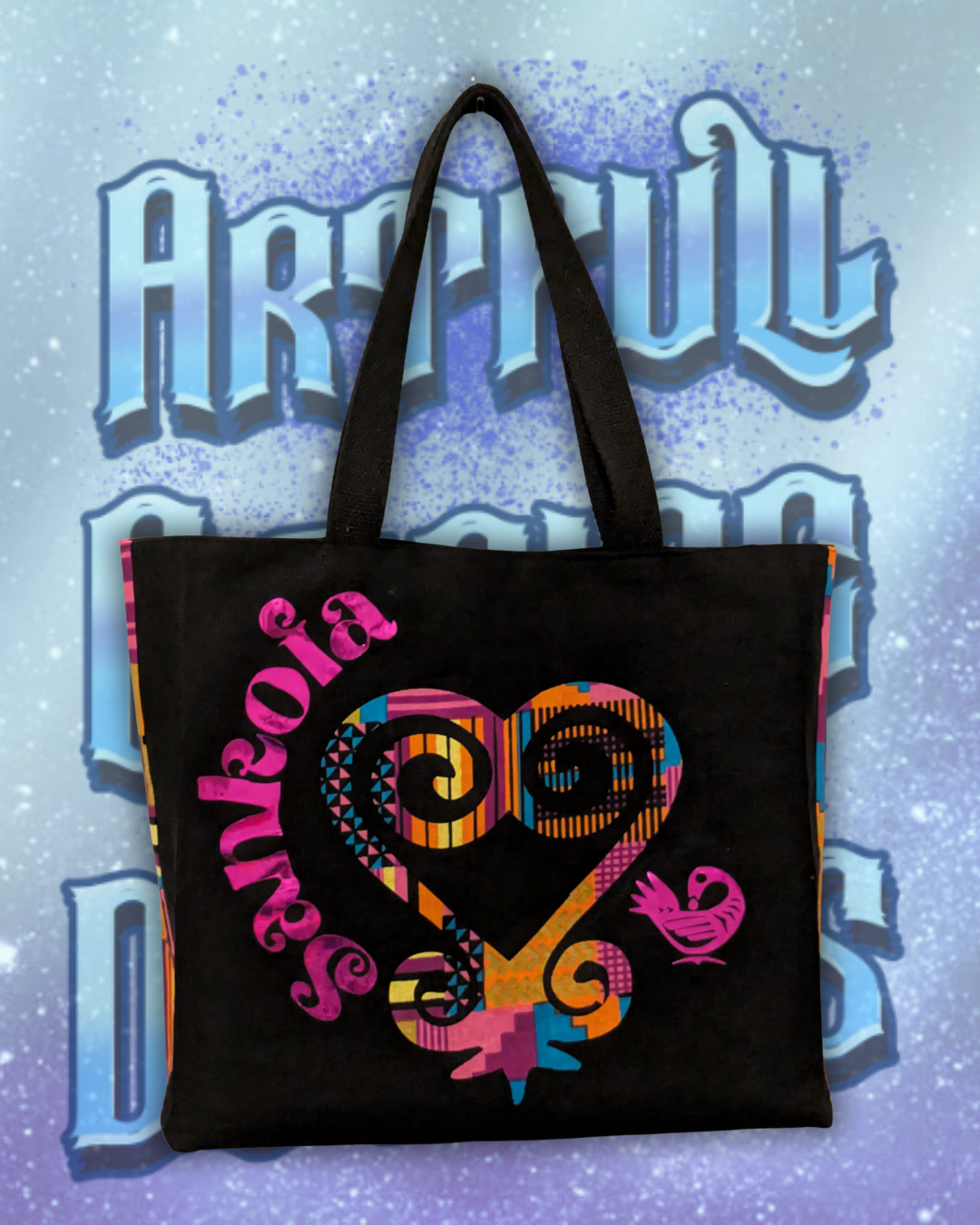 Adorned with a stunning, stylized heart and the iconic sankofa symbol crafted from vibrant pink kente print fabric, this tote captures the essence of cultural pride. The magenta metallic vinyl lettering proudly spells out “sankofa,” accompanied by its emblematic bird, reminding us all to cherish our roots while journeying into the future.
