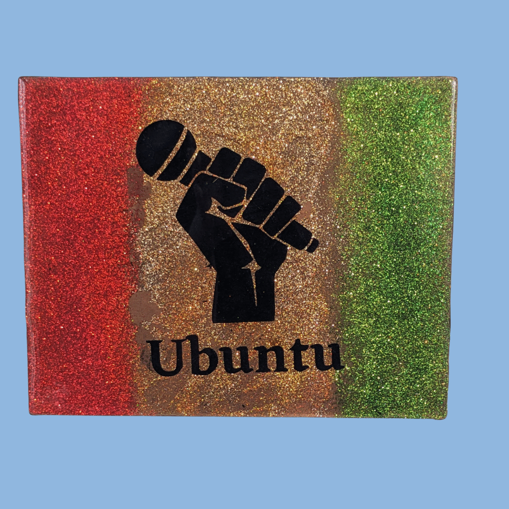 I’m excited to share my latest mixed media piece, Ubuntu Speaks. Measuring 10 by 8 inches, this artwork centers on a raised black fist gripping a microphone, created with textured vinyl that gives tangible presence to its form. Behind it, vertical stripes of red, gold, and green glitter shimmer against a metallic copper background, adding depth and vibrancy. Just below the fist, the word “Ubuntu” stands boldly, anchoring the composition with clarity and intention.