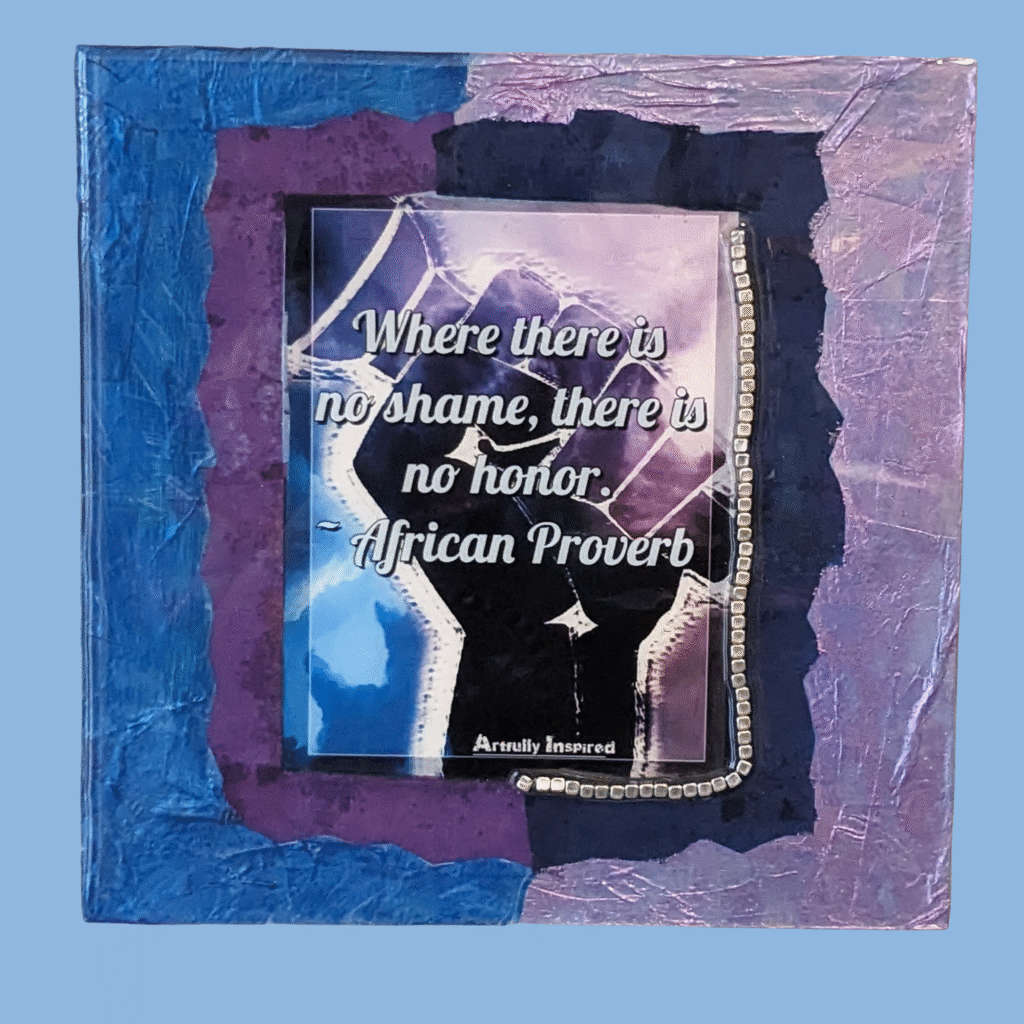 Introducing the “No Honor” Art Piece – a captivating blend of cultural wisdom and artistic expression. Inspired by the profound African proverb, “Where there is no shame there is no honor,” this mixed media masterpiece is a powerful reminder of our inherent human dignity. This artwork encapsulates the essence of our shared humanity, inviting you to reflect on the importance of embracing honor and dignity in every aspect of life. Display it proudly in your space and let it inspire you daily to live with grace and integrity.